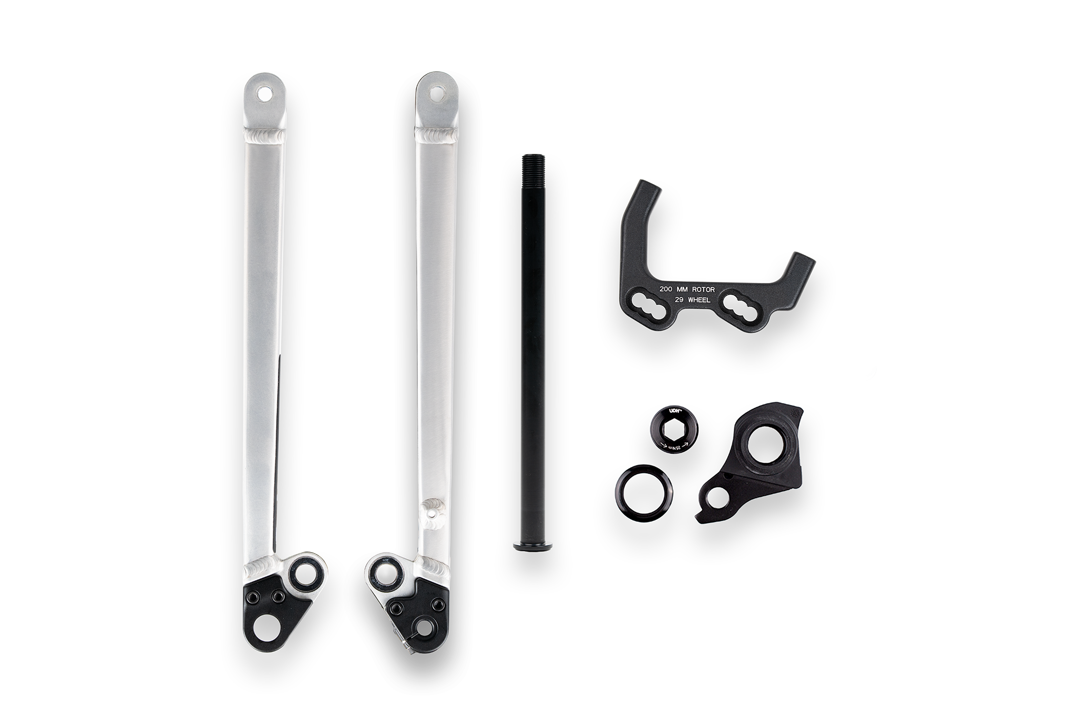 The kit consists of left and right seatstays, mid-dropouts, a rear wheel axle, a UDH hanger, and the updated brake mount.